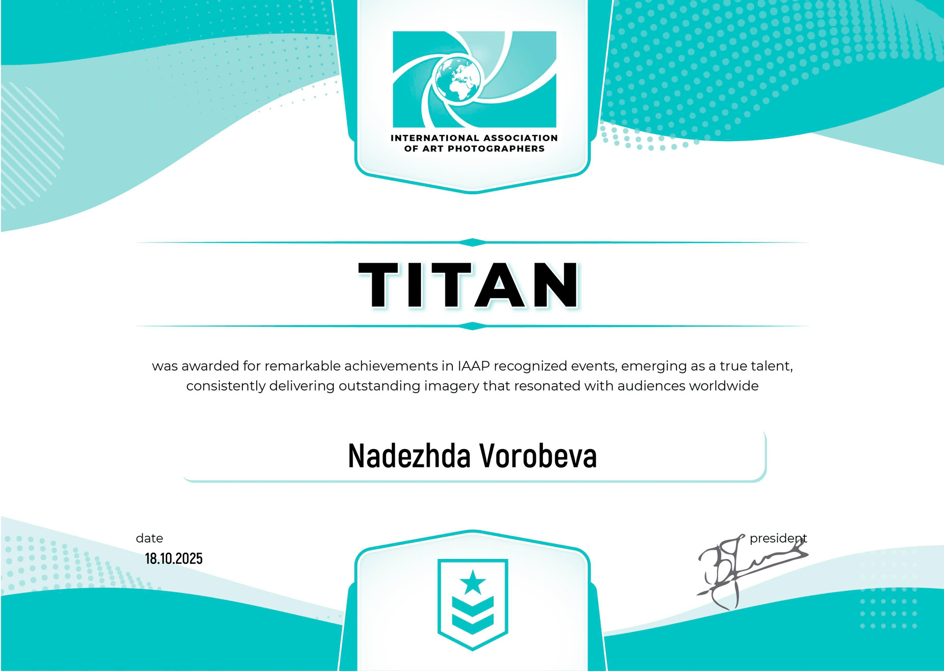 С января 2025 года являюсь пожизненным членом ассоциации фотографов Евразия (официальное представительство FIAP в России). eurasia-photo.com